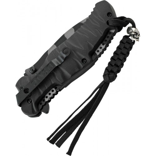 4 3/4" closed linerlock. 3 5/8 urban camo finish 440C stainless partially serrated spear point blade with dual thumb studs and extended tang. Manual opening. Thick, grooved black rubberized handles with USMC inlay medallion shield. Top of handles feature a partially opened spine with a drilled hole design and ridge. Lanyard hole with black braided nylon lanyard and skull bead. Black stainless pocket clip.