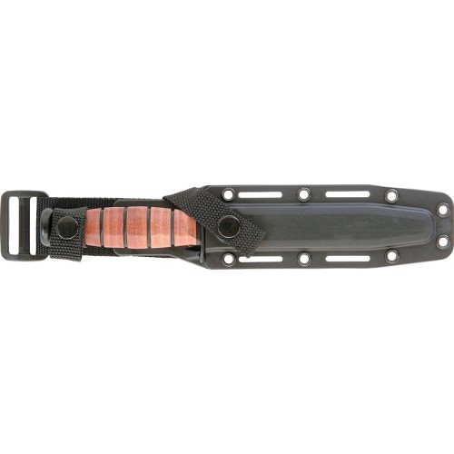 12" overall. 7" partially serrated black epoxy powder coated carbon steel blade with USMC tang stamp. Stacked leather handle with black epoxy powder coated carbon steel guard and pommel. Black glass filled nylon belt sheath.