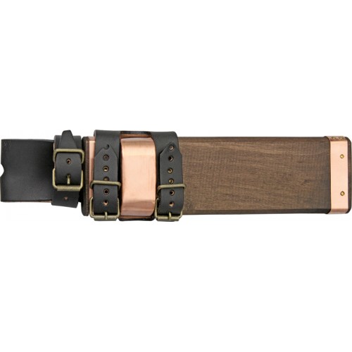 Kanetsune Yoroi. 11 1/2" overall. 8" blade. Brown oak wood handle. Brown magnolia wood scabbard with copper trim and black leather buckle style closure.