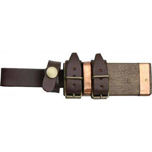 7 1/2" overall. 2 3/4" 15 layer Damascus blue steel blade. Round design oak handle with black finish steel finger guard. Magnolia wood sheath with brown leather buckle style closure and copper finish metal trim.