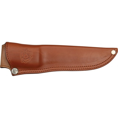 Katz Lion King. 11" overall. 6 1/8" XT-80 stainless blade. Full tang. Blond ashwood handle with nickel silver finger guard and pommel. Inlay shield. Lanyard hole. Brown leather belt sheath.