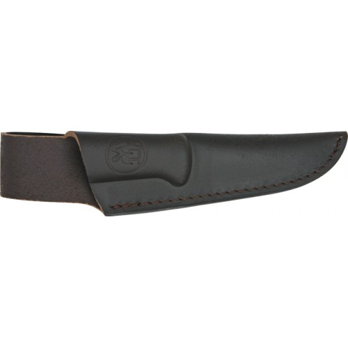 7 3/4" overall. 3 1/2" stainless blade. Full tang. Ram's horn handles with brass finger guard and aluminum pommel. Leather belt sheath.