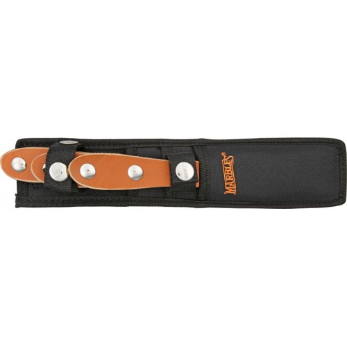 Knife Set. Knives are 8 1/2" overall with 4 1/2" stainless double edge blade. Full tang. Brown leather onlay handles with triple rivets. Black nylon belt sheath.