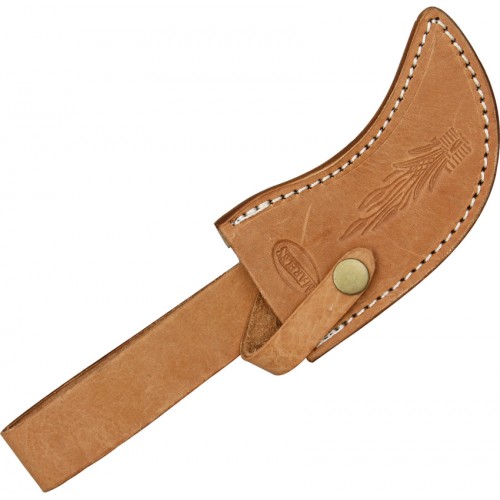 9 5/8" overall. 4 3/8" surgical steel upswept skinner blade with thumb ridge. Brown leather wrapped handle with brass finger guard and split stag pommel. Embossed brown leather belt sheath.