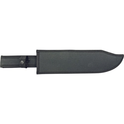 16" overall. 10 5/8" black finish stainless sawback blade. Grooved black finish metal handle with black finish guard and pommel. Stored inside handle is compass and survival kit. Black nylon belt sheath.