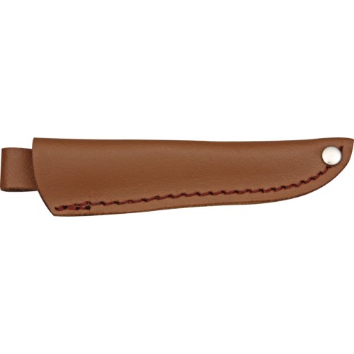 6" overall. 2 3/4" carbon steel blade. Full tang. Faux ivory handles with brushed stainless bolster and extended tang end with lanyard hole. Brown leather belt sheath.
