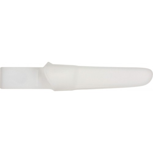 Mora Craftline Flex Knife. 8" overall. 3 3/8" stainless blade. Black textured rubber handle with blue trim. Black plastic belt sheath with drain hole.