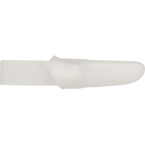 Mora Craftline Installer Knife. 6 1/4" overall. 1 3/4" stainless blade. Black textured rubber handle with yellow trim. Translucent plastic belt sheath with drain hole.