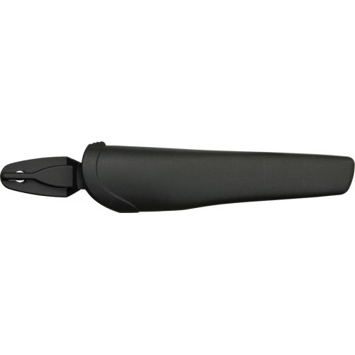 Mora Craftline All-Around Knife. 9 1/8" overall. 4" stainless blade. Black textured rubber handle with blue trim. Black plastic belt sheath with drain hole.