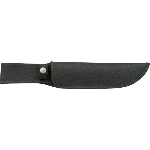 13 1/2" overall. 8 1/4" black finish 440 stainless blade. Finger grooved black rubber handle with black finish stainless guard. Lanyard hole. Black nylon belt sheath.