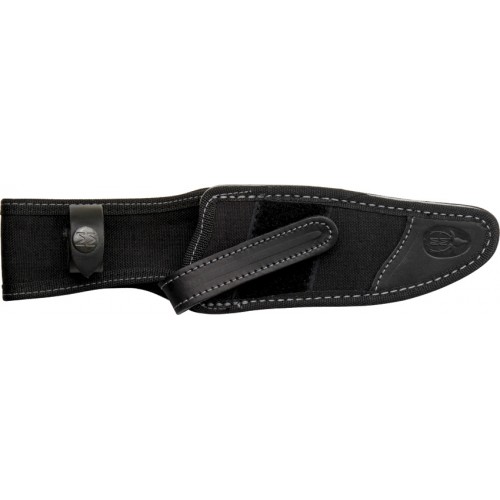 Black Teflon coated blade. 10 3/4" overall. 6" 440C stainless blade. Full tang. Black micarta handles. Extended tang with lanyard slot and lanyard. Black leather belt sheath.