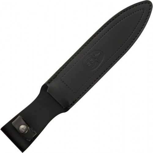 Muela Scorpion. 12 1/2" overall. 6 3/4" black coated stainless false edge blade. Black metal guard. Black rubber handle. Lanyard hole. Black leather belt sheath.