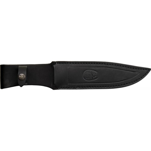 12" overall. 7" black finish 440C stainless partially serrated blade. Black checkered rubber handle with integral guard. Lanyard hole. Black leather belt sheath.