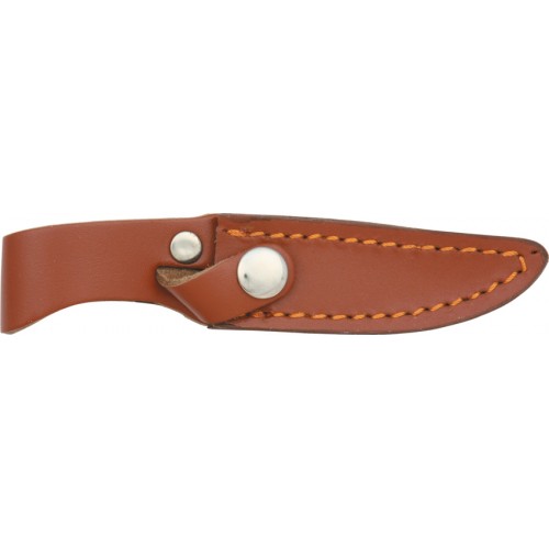 Size Miniature Bowie. 5" overall. 2 5/8" stainless blade. Full tang. White smooth bone handles. Brown leather belt sheath.