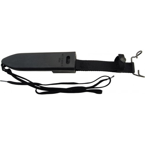 10 7/8" overall. 6 1/2" black oxide finish stainless sawback blade. Molded black checkered high-impact plastic handle. Cordura and plastic sheath.