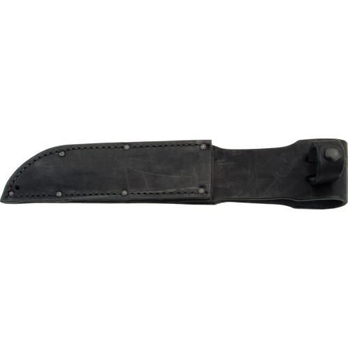 12" overall. 7" black zinc phosphate coated 1095 carbon steel blade with blood groove. Black weather proofed leather handle. Steel butt cap. Black leather belt sheath.