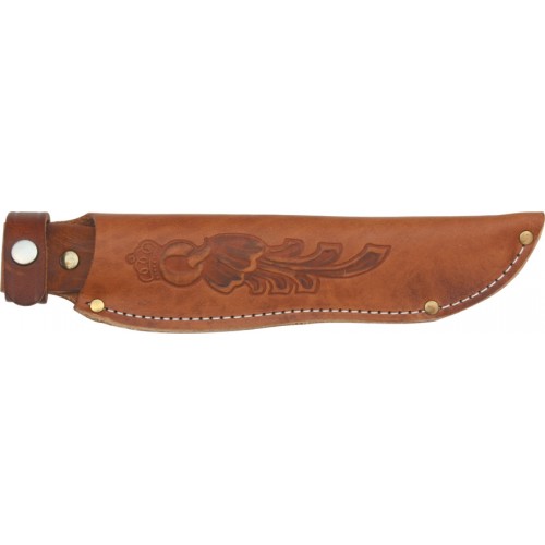 Queen Drop Point Hunter. 8" overall. 3 1/2" satin finish D2 tool steel drop point blade. Full tang. Green maple burl handles. Embossed leather belt sheath.