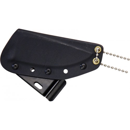 6 5/8" overall. 3 3/4" partially serrated drop point blade. One piece 1095 high carbon steel construction with black traction coating. Hardened to 56-58 HRC. Dual thumb ridges on blade and handle. Yellow cord wrapped skeletonized handle design can be used as a bottle opener. Lanyard hole. Black molded Kydex sheath with metal clip, ballchain lanyard and survival whistle. Serial numbered. Certificate of Authenticity. Bulk packed.