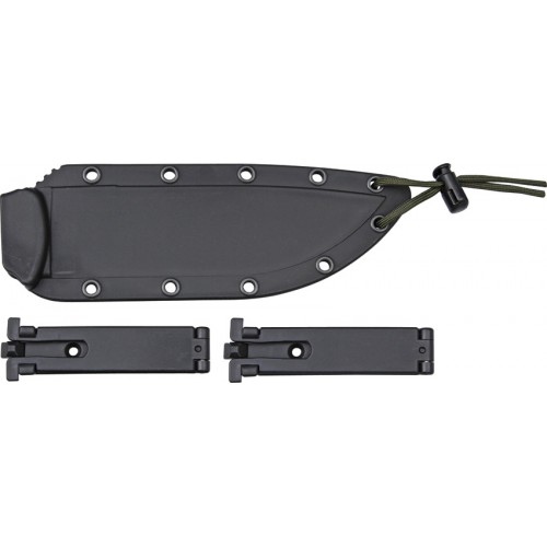 ESEE Model 6 Plain Edge. 11 3/4" overall. 5 3/4" black finish 1095 carbon steel blade with partially sharpened top edge. Full tang. Black linen micarta handles with rounded pommel and lanyard. Coyote brown molded sheath with lanyard, cord lock and boot clip with clip plate.