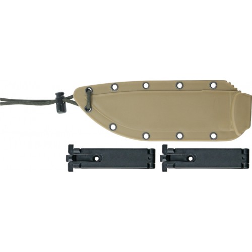 ESEE Model 6 Plain Edge. 11 3/4" overall. 5 3/4" black finish 1095 carbon steel blade with partially sharpened top edge. Full tang. Black linen micarta handles with rounded pommel and lanyard. Black molded sheath with lanyard, cord lock and boot clip with clip plate.