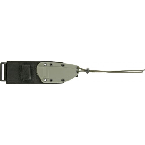 ESEE Model 3MIL. Designed for law enforcement and military duty. 8 1/4" overall. 3 7/8" textured black powder coated 1095 carbon steel partially serrated blade. Full tang. Light green canvas micarta handles. Glass breaker pommel. Lanyard hole. Jump-Proof sheath with spring steel clip plate.