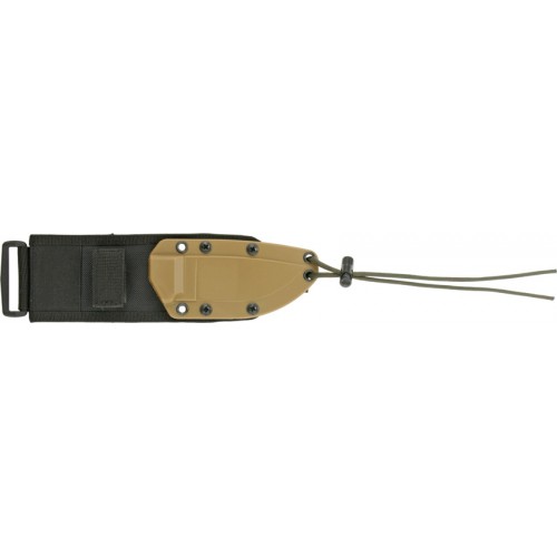 ESEE Model 3 Standard Edge. 8 1/4" overall. 3 3/4" "Super Tuff" black textured powder coated 1095 carbon steel blade. Full tang. Black linen micarta handles. Glass breaker pommel. Molded coyote brown Kydex® sheath with cordura MOLLE back and spring steel clip plate.