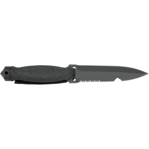 11 5/8" overall. 5 5/8" black matte finish N690 stainless cobalt steel blade with partially serrated top edge and line cutter. Back textured polyamide handle with skull crusher pommel. Handle may be disassembled so blade may be attached to pole or spear. Black ABS and nylon belt sheath with arm/leg straps. Also comes with Tek-Lok. Knife comes in plastic storage case.