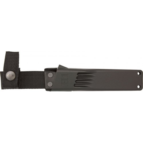8 3/8" overall. VG-10 stainless blade. Black checkered Thermorun elastomer handle with visible tang end and lanyard hole. Black Zytel belt sheath.