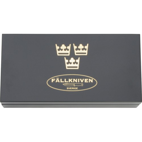 Hunter. 6 3/4" overall. 3 1/8" 3G laminate powder steel drop point blade with Tre Kronor - three crowns Swedish coat of arms etch. Brown cocobolo handles with stainless guard and visible tang end features "Three Crowns" inlay shield. Lanyard hole. Black leather belt sheath. Comes in black wooden display box with black velvet vacuum formed insert.