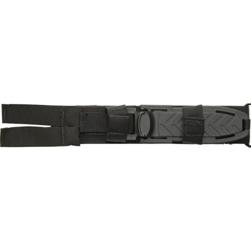 Gerber CFB Combat Fixed Blade. 9 1/2" overall. 4 1/2" black finish partially serrated 154CM stainless tanto blade. Full tang with extended blunt pommel with lanyard hole. Textured black rubberized onlay handles. Black molded plastic sheath for multiple carry options on a belt or a MOLLE compatible vest. Sheath has black cord lanyard.