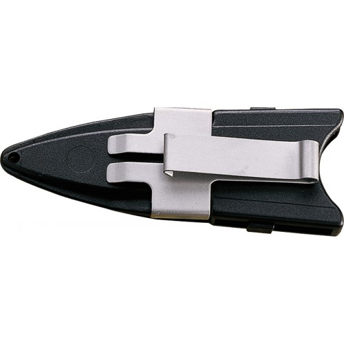 Guardian Back Up. 7 1/2" overall. 3 1/4" black coated stainless double edge blade. Santoprene rubber handle. Black molded sheath with metal boot/belt clip.