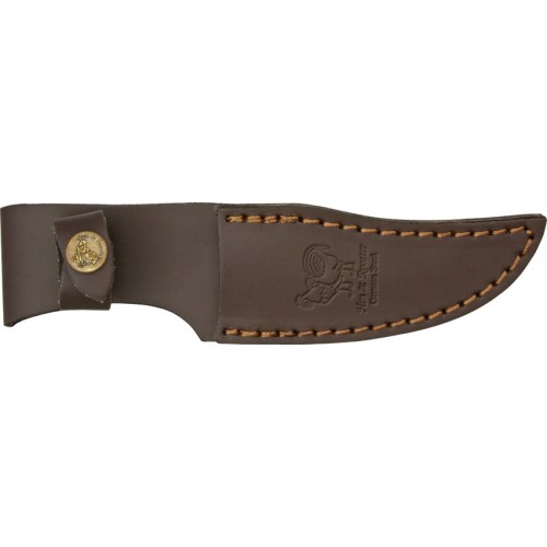H&R Skinner. 7 1/2" overall. 4" stainless upswept blade. Full tang. Ram's horn handles. Brown leather belt sheath. Made in Spain.