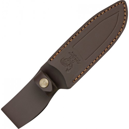 H&R Stag Bowie Blue. 9 3/4" overall. 5 1/8" German stainless blade. Full tang. Blue stag handles with stainless finger guard. Embossed brown leather belt sheath. Made in Spain.