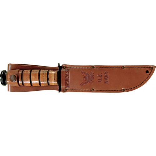 Ka-bar US Navy Fighter. Famous in its own right with a historical background and part of an American legend. 12" overall. 7" black epoxy powder coated 1095 high carbon steel blade with USN tang stamp. Polished stacked leather handle with black epoxy powder coated carbon steel guard and butt. Brown leather belt sheath with U.S. Navy logo.