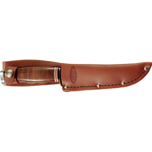 Ka-bar Hunter. 8 1/8" overall. 3 3/4" saber-ground stainless utility blade. Polished leather handle with brass guard and aluminum pommel. Brown leather belt sheath.