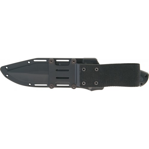 Ka-Bar Bull Dozier Fixed Blade. 12 1/4" overall. 6 1/2" black finish AUS-8A stainless blade. Black Zytel® handle with black textured Kraton G® inserts and integrated guard. Black molded plastic and nylon belt sheath. Designed by Bob Dozier.