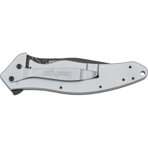 4 1/2" closed framelock. Speed-Safe assisted opening ladder damascus steel blade. Matte finish 410 stainless handles. Reversible stainless pocket clip. Lanyard hole.