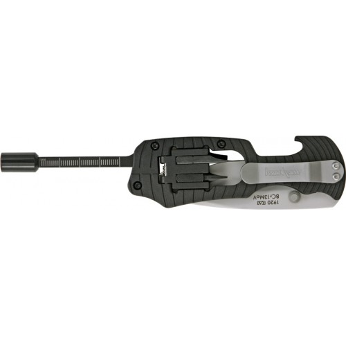 4 1/4" closed linerlock. 3 1/4" 8Cr13MoV stainless blade with bead blast finish with dual thumb studs. Black glass filled nylon handle. Fold out bit driver. Four bits are stored inside handle - two standard and two Phillips. Matte finish stainless pocket clip.