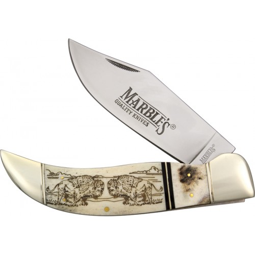 Wildlife Scrimshaw Series. 3 3/4" closed. Stainless clip, spey and sheepsfoot blades. White bone handles with nickels silver bolsters and buffalo scrimshaw style artwork. Attractive display box.