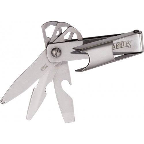 3" closed. Three implements rotate out of handle. Features (1) medium flathead screwdriver tip, wire striper and 1 1/2" sharpened edge; (2) large flathead screwdriver, hook/bottle opener; and (3) Phillips screwdriver. End of each implement has hex wrench. Polished stainless handles. Implements store inside handle when not in use.