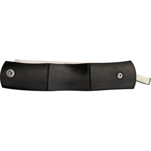 3" closed. 2 1/4" AUS-8 stainless blade. Polished stainless money clip is the back handle. The stainless steel handle has a slip-joint mechanism for simple operation. Dark wood front handle. A floating loop on the handle can be used with the included paracord lanyard.
