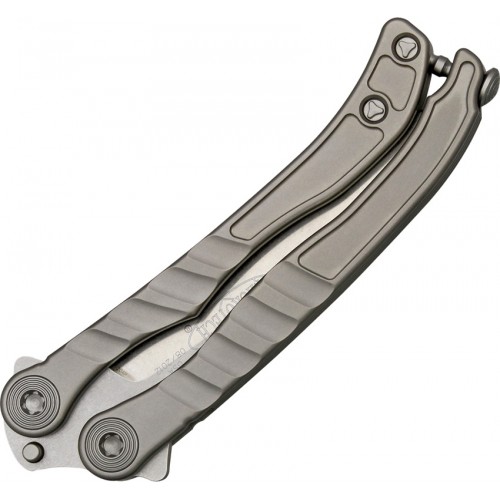Microtech Metalmark Balisong. 5" closed. 3 3/4" 154-CM/S-35 VN stainless standard edge blade with stonewash finish. The handle is machined from solid 6AL-4V titanium billet and features a spring assisted thumb latch, an asymmetrical handle for improved grip, and a unique ceramic pivot bearing system. Matte finish handles. This knife is designed to conceal the blade in the handle, but open smoothly and quickly.