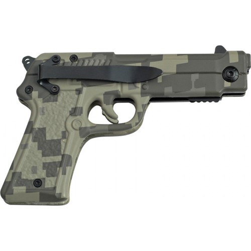 4 1/2" closed linerlock. 3 1/4" black finish 440 stainless blade with extended tang, thumb slot, and ".45 Semi Auto" blade etching. Digital green camo finish aluminum handles in shape of a handgun. Lanyard loop. Black finish stainless pocket clip.