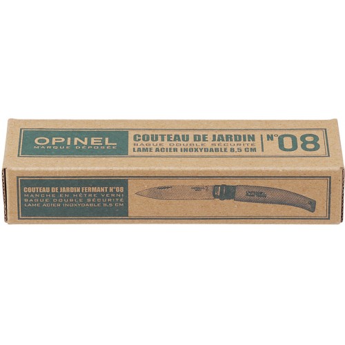 Opinel Garden Knife. 4 1/4" closed. Stainless blade with crowned hand hallmark etching. Oak handle. Safety ring for locking the blade.