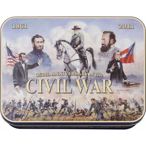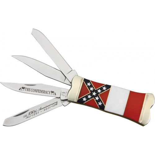 150th Anniversary. Includes a Double Take Trapper. 4" closed. 1 7/8" wide. Clip and spey blades on each side. Clip blade is etched The Union. Spey blade is etched 150th Anniversary 1861-2011. Red, white and blue celluloid handles. Front handle has resemblance of American flag and back handle has resemblance of Confederate flag. Grooved nickel silver bolsters. Gift tin with color Civil War artwork. Includes an authentic civil war bullet.