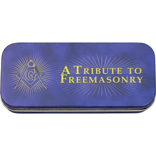 Rough Rider Masonic Barlow. 3 1/4" closed. 440 stainless clip and pen blades. Masonic blue smooth bone handles, grooved nickel silver bolster(s) and Masonic inlay shield. Master blade features "In Search of More Light" artwork. Comes in "A Tribute to Freemasonry" gift tin.