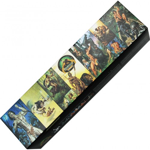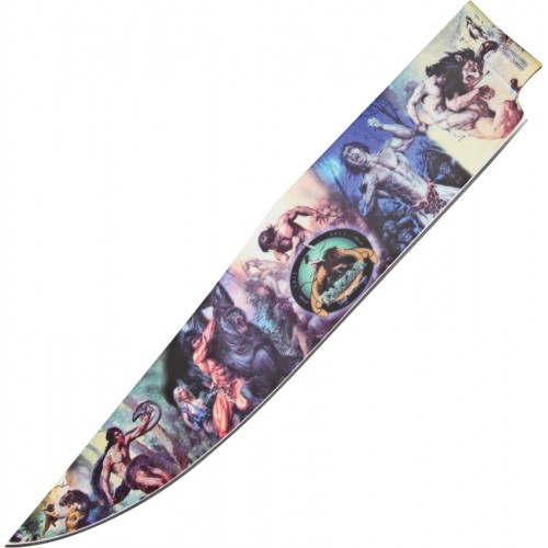 Rough Rider Tarzan 100th Anniversary Bowie. 14" overall. 9" 440 stainless bowie blade with detailed full color art on front and back. Full tang. Brown wood handles with nickel silver guard. Wood display stand (some assembly required - hardware included). Tarzan® was first introduced by Edgar Rice Burroughs in 1912, taking readers to far-away lands on incredible adventures and making Tarzan® one of the most popular characters in history. This is sure to be a collectible!