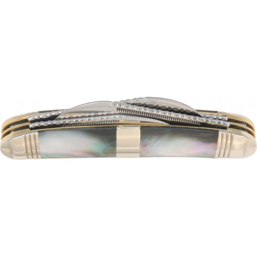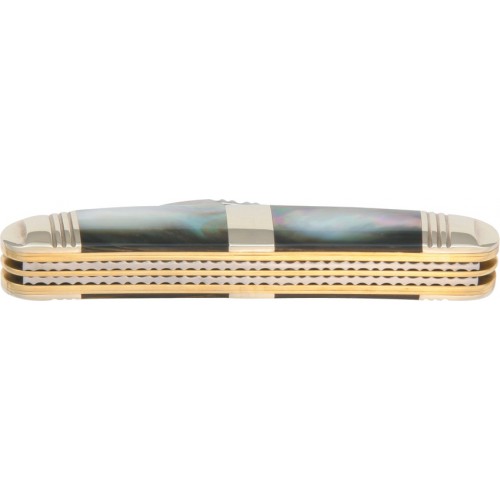 4 1/4" closed four blade. 440 stainless blades. Black mother of pearl handles with nickel silver spacer stripe. Grooved nickel silver bolsters. Black wooden display box with vacuum formed insert.