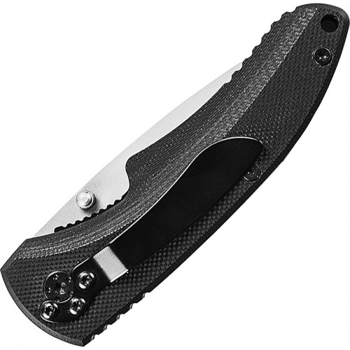 Linerlock. 3 5/8" closed. 2 5/8" matte finish 9Cr14MoV partially serrated stainless drop point blade with dual thumb studs. Black G-10 handles with index finger rest. Lanyard hole. Black stainless pocket clip.