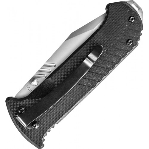 4 1/2" closed. 3 1/8" matte finish 9Cr14MoV partially serrated stainless grooved tanto blade with dual thumb studs. Black grooved G-10 handles. Extended tang with lanyard slot. Black stainless pocket clip.